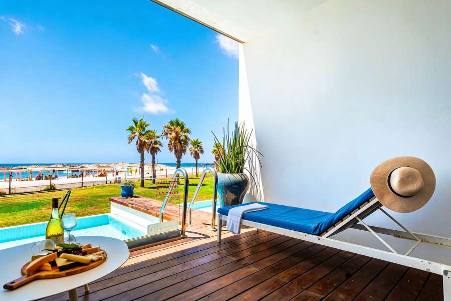 מרפסת מרוצפת בעץ "איפאה" בעלת ריהוט גן יוקרתי ניצבת גם היא אל מול הים, מיטת קינג- סייז